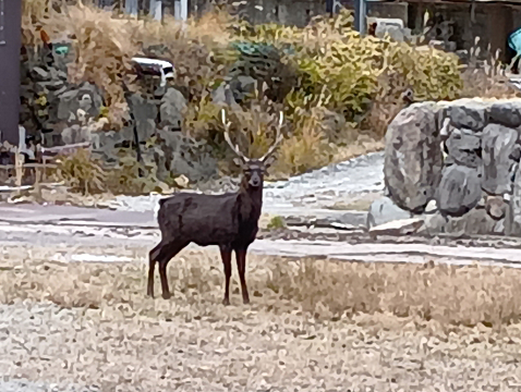 九重地区でこの十数年で爆発的に増えたのが鹿です。ホテルの敷地内でもよく見かけますが黒い個体が多いです。鹿は悪食なので敷地内の植物何でも食べまくって困ります。特に冬から春にかけては被害甚大で(;´д`)トホホです・・